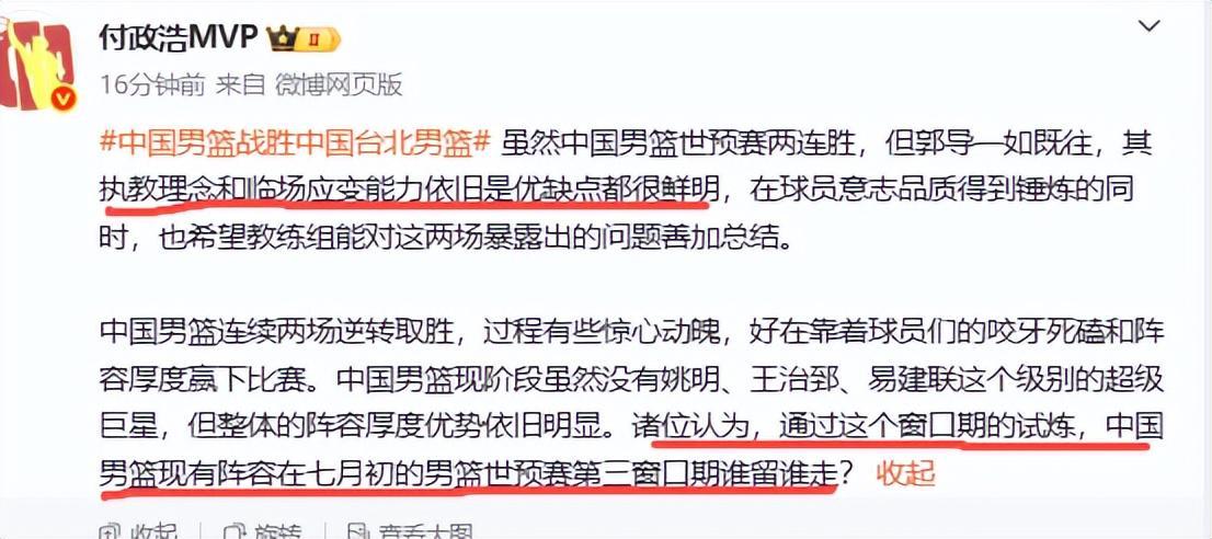 中国男篮与台北队的比赛,是与日本队比赛的翻版,又是落后11分,又是实现了大逆转,最终100比93险胜对手,取得世预赛第二窗口期的两连胜。这场打得好的是朱俊龙,他三分6投5中,外线进攻非常高效,轰下全队最高的19分,还有4个篮板2次助攻。当然胡金秋也打得不错,拿到全队第二高的15分。在末节的追分时刻,赵继伟投中了英雄球,一个九米远的三分球被抢打中。李弘权最后一...
