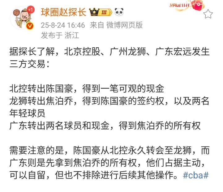 在CBA联赛的这个休赛期里,北控男篮一直在主导多方交易,目的是为了得到国产后卫王岚嵚,目前这笔交易的结果已经出炉。据媒体人“球圈赵探长”透露,北控男篮、广州男篮和广东男篮之间的三方交易已经完成,北控男篮送出陈国豪,得到了一笔数额可观的现金;广州男篮送出焦伯乔,得到了陈国豪的签约权以及两名年轻球员;广东男篮方面则是送出了两名年轻球员和现金,得到了国手中锋焦伯乔的签约权。之前付政浩曾经透露过,广东男篮通过交易得到了陈国豪,现在来看的话他的消息有些出入。